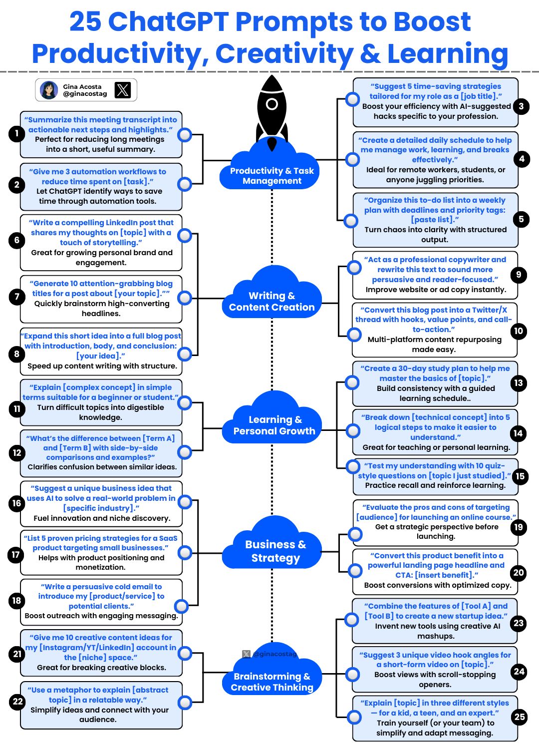 - 25 ChatGPT Prompts to Boost Productivity, Creativity & Learning ๐