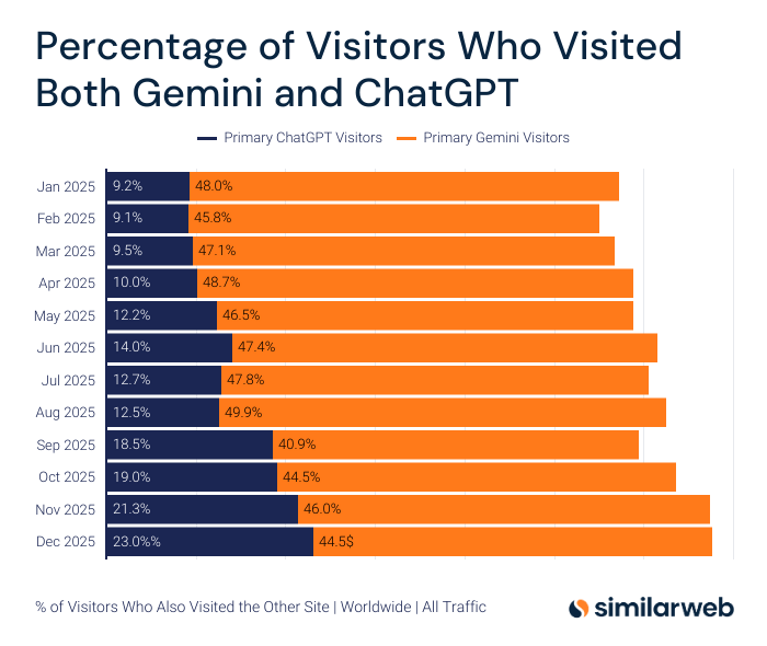 Throughout 2025, more ChatGPT users also visited Gemini, with the overlap steadily increasing over time.