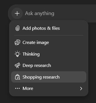 Open ChatGPT, click the plus (+) button and select Shopping Research.