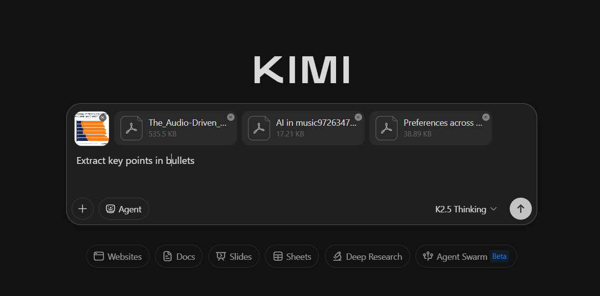 Kimi can handle up to 50 files at the same time, including PDFs, docs, PPTs, and images.