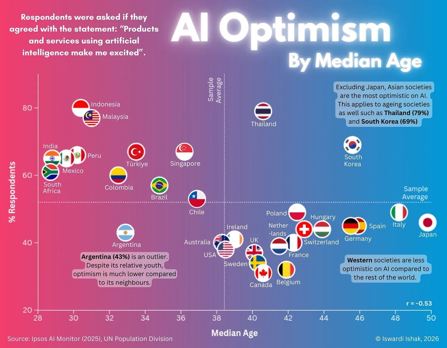 Indonesia (80%), Malaysia (75%), and India (67%) lead globally, while many Western countries with older populations, such as Canada (36%) and France (38%), show much lower enthusiasm.